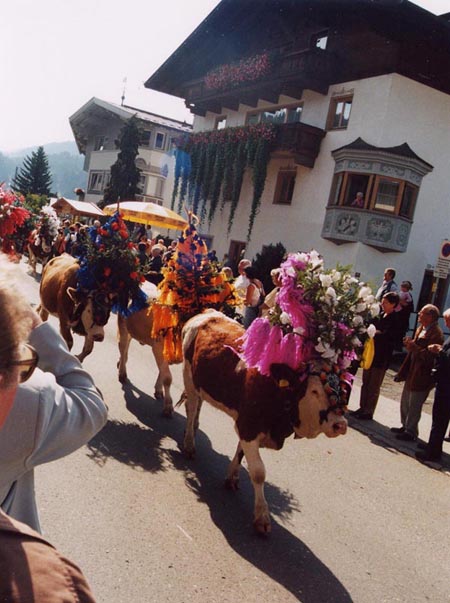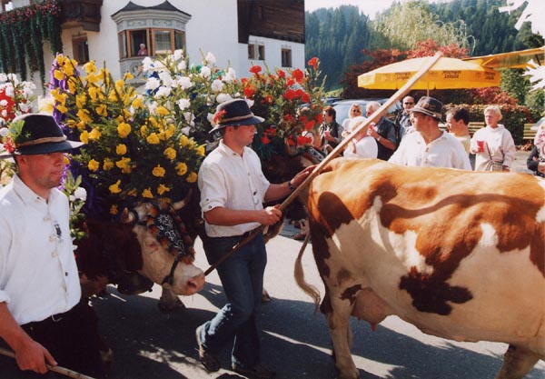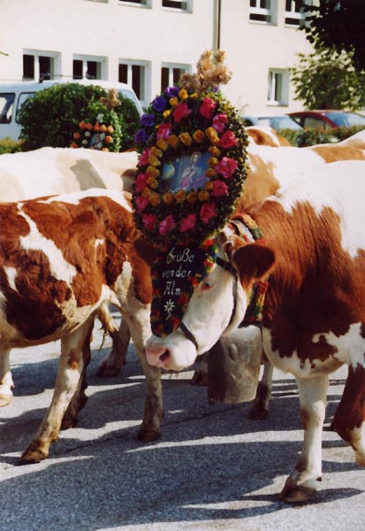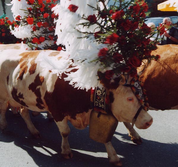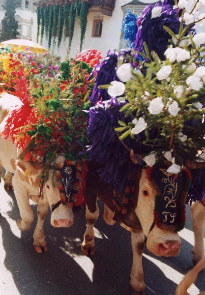 The cows are adorned with religious icons, flowers, and bells